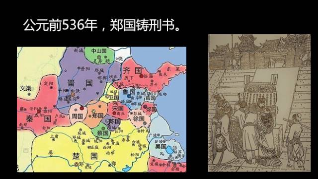 虽然文献记载子产在公元前536年颁布了法律,铸刑鼎,晋国也在二十年后铸刑鼎,遗憾的是,我们现在还没找到实物,只有一些文献说明,而且这些文献还没有详细系统地记载刑典的内容,我们看不到具体的法律条款。