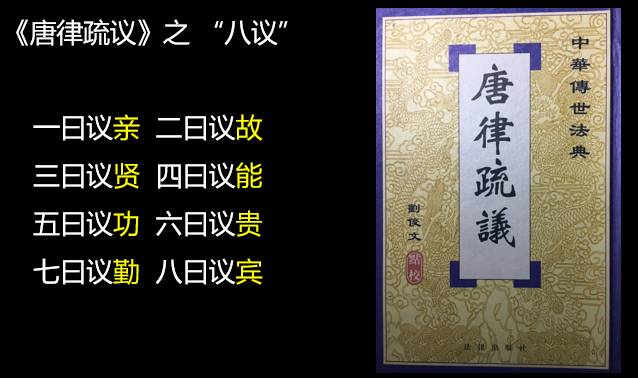 这种以君王、王公贵族为中心,对司法的超越后来直接写入了中国的成文法典。比如《唐律疏议》, 这是唐朝重要的法典。它把“八辟”改成了“八议”, 意思完全一样。如果碰到案件,这八类人犯法,法官不能直接处理,要向皇帝汇报,由皇帝自己定夺。这八类是“亲”、“故”、“贤”、“能”、“功”、“贵”、“勤”、“宾”,这跟“八辟”是一样的。虽然《唐律疏议》里面对什么是“亲”,什么是“故”、什么是“贵”、什么是“宾”都有相应的界定,但那是一个非常宽泛的范围。